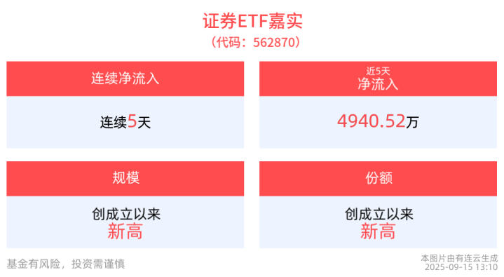 规模方面,证券ETF嘉实最新规模达4.66亿元,创成立以来新高。份额方面,证券ETF嘉实最新份额达4.40亿份,创成立以来新高。从资金净流入方面来看,证券ETF嘉实近5天获得连续资金净流入,最高单日获得1835.44万元净流入,合计“吸金”4940.52万元。