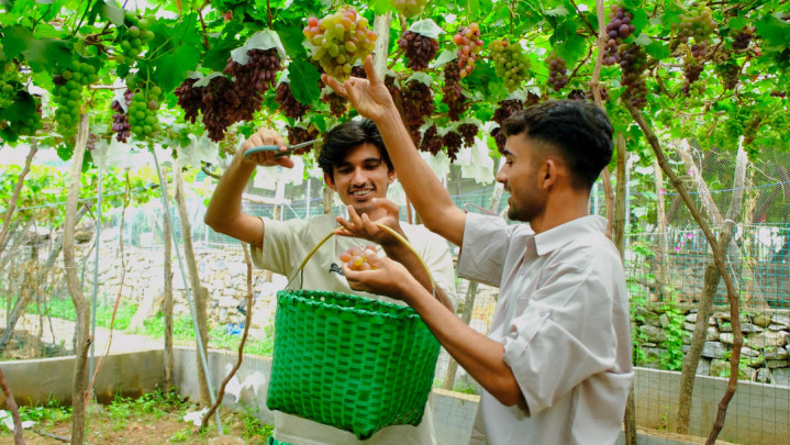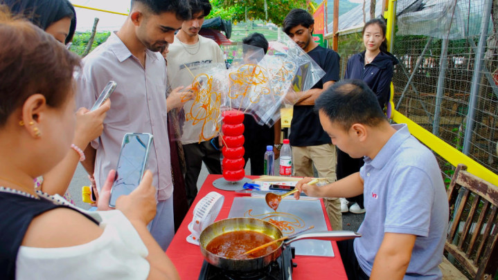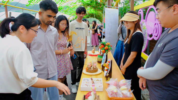洪门村是北庄镇以盛产葡萄闻名远近的特色村,是全国农业旅游示范点、中国传统村落、首批省级旅游特色村,全村庭院经济开发率达98%以上,全村葡萄种植面积已突破2000亩大关。来自孟加拉国的Kamrul、Mishu,尼泊尔的LopsangLama和巴基斯坦的Rehman、Zahid、Sarfraz6名外国友人,在享受采摘之旅的同时,还在浪漫的初秋果园里,近距离体验了枣庄传统非遗技艺,布艺、烙画、剪纸、糖人,精巧的作品引来他们的阵阵赞叹。